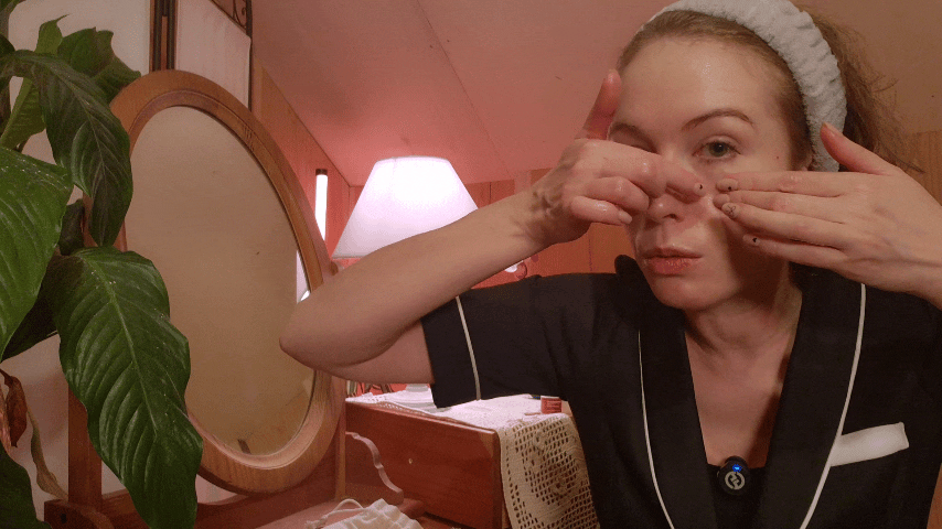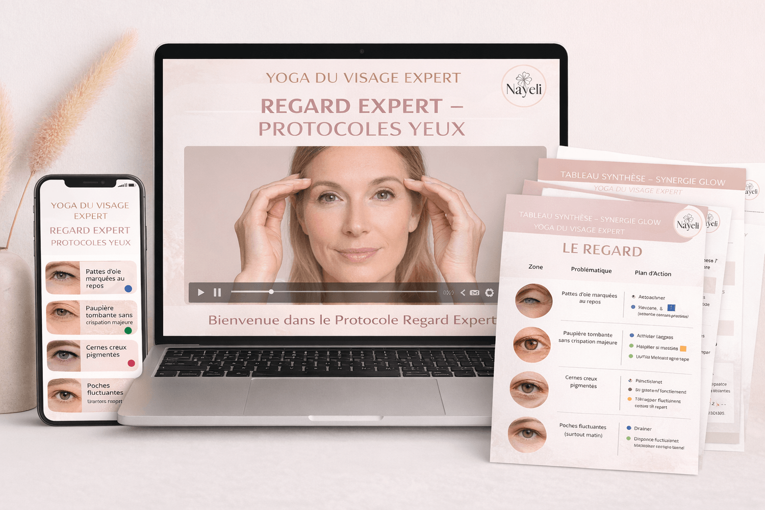 La zone des yeux est traitée avec précision, pression contrôlée et respiration intégrée.